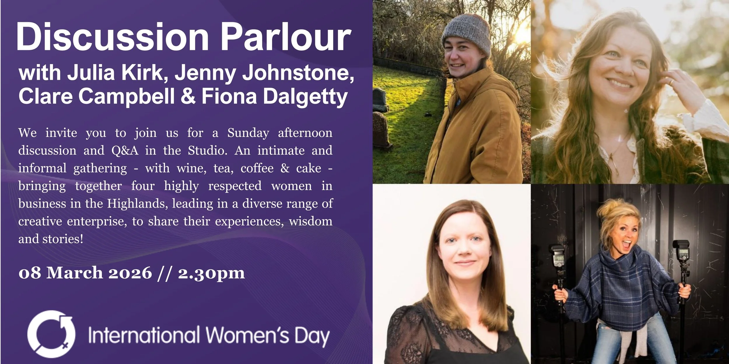 We invite you to join us in the Studio for an intimate and informal gathering, bringing together four highly respected women in business in the Highlands, leading in a diverse range of creative enterprise, to share their experiences, wisdom and stories!